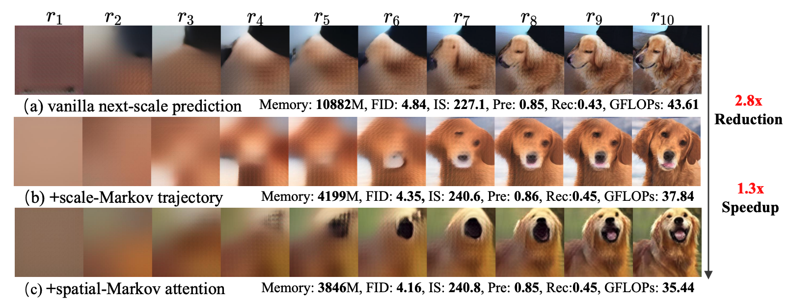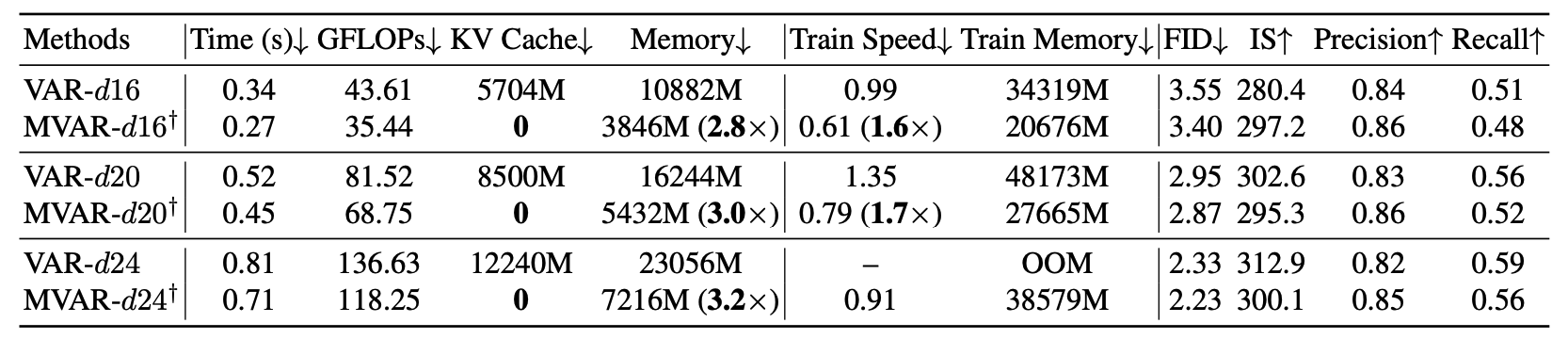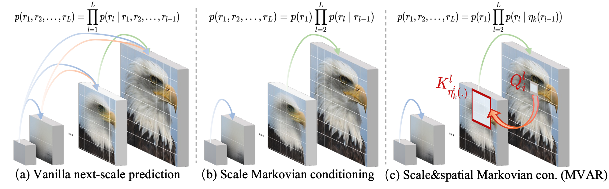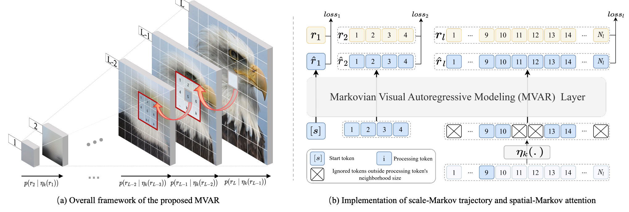 🔥 3.0× Memory Efficiency & KV-Cache Free Inference. We propose Markovian Visual AutoRegressive modeling (MVAR), which introduces scale and spatial Markov assumptions to mitigate redundancy in visual generation. By reducing complexity from O(N^2) to O(N×k), MVAR enables parallel training on just eight RTX 4090s and achieves state-of-the-art performance on ImageNet.